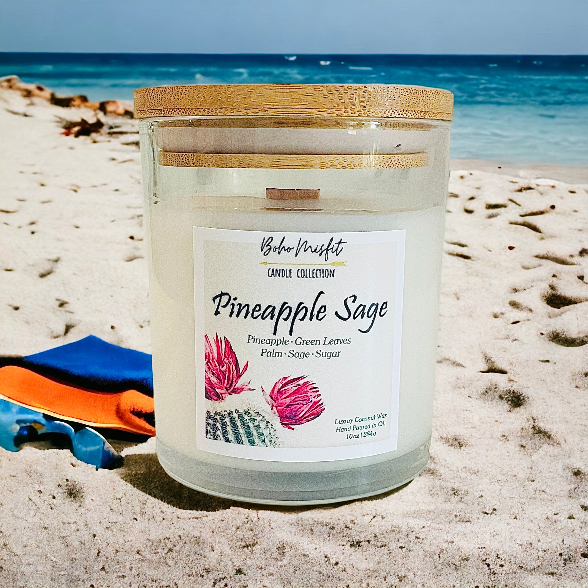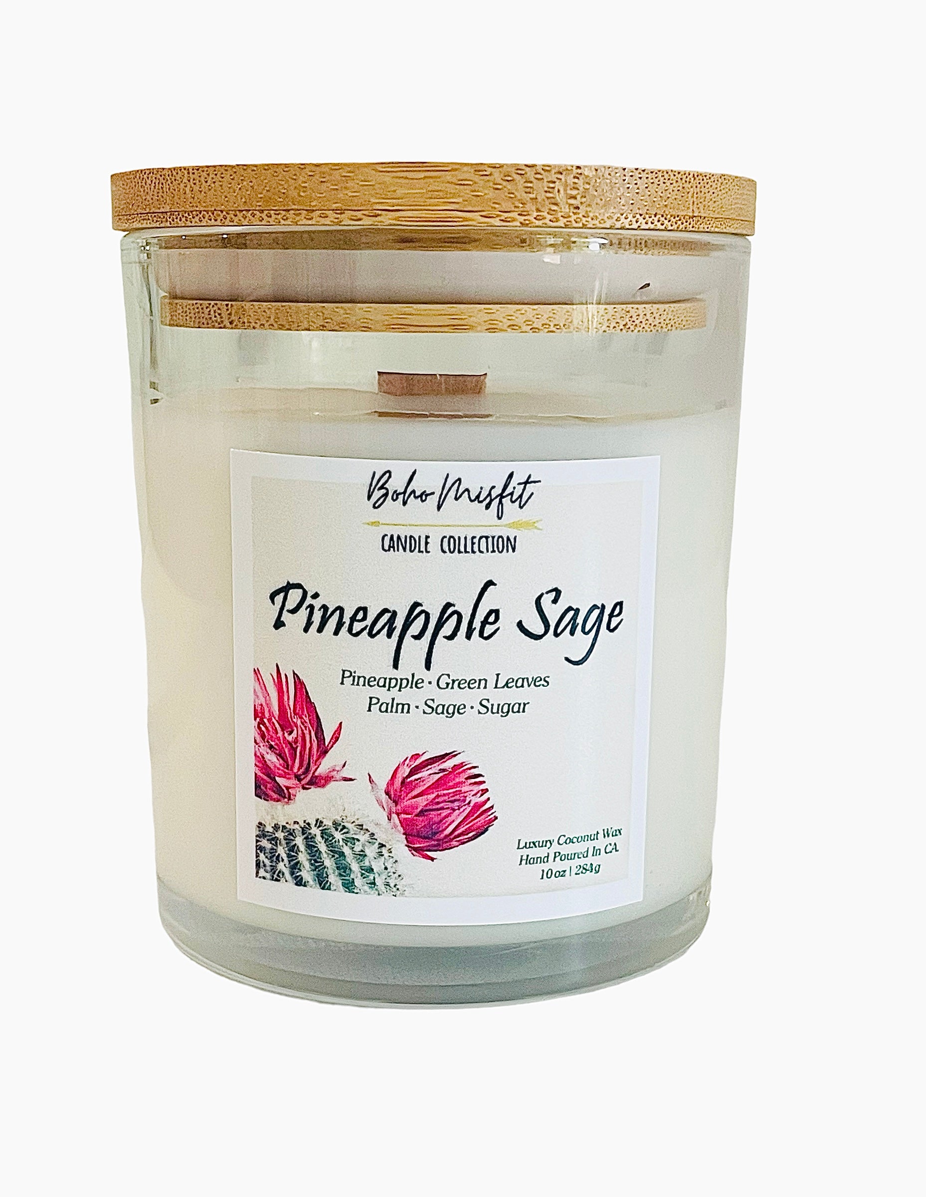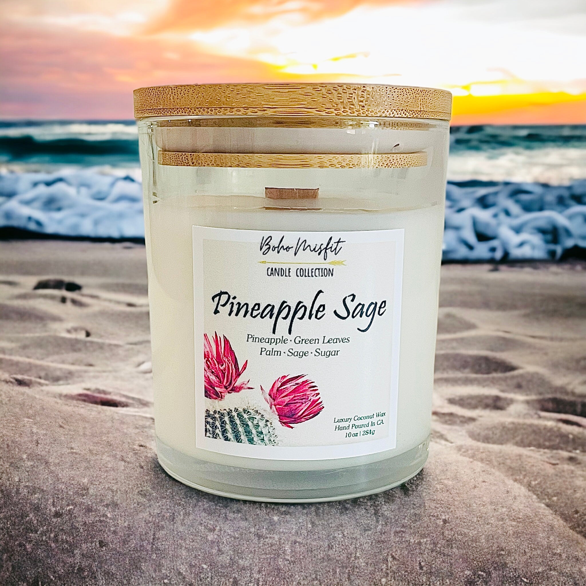 A tropical blend of pineapple, sage, and green leaves, this scent has a fresh-cut pineapple top note while a heart of green leaves, anise, and palm adds depth. Earthy sage and sweet sugar in the base round out this versatile fruit fragrance.