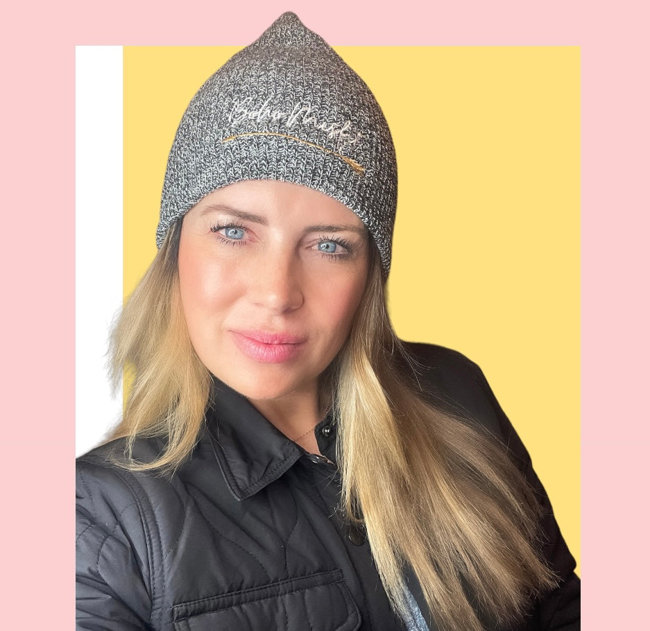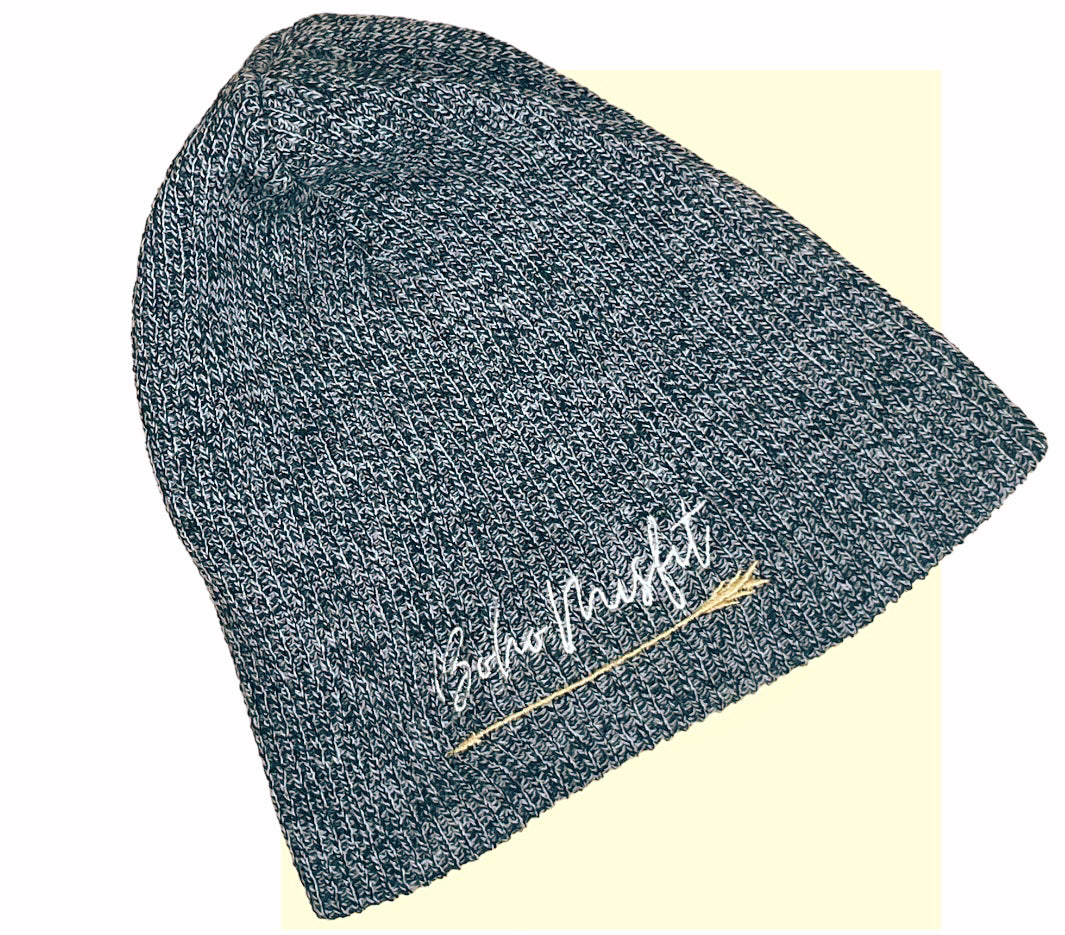 Light gray knitted beanie with Boho Misfit logo stitched on.