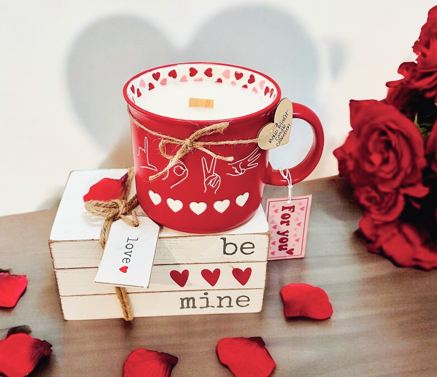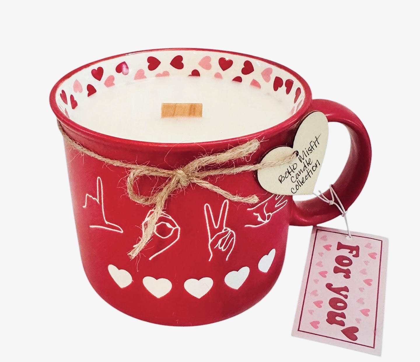 20oz luxury coconut wax candle with a wood crackling wick in a reusable Love Sign Language Coffee Mug.